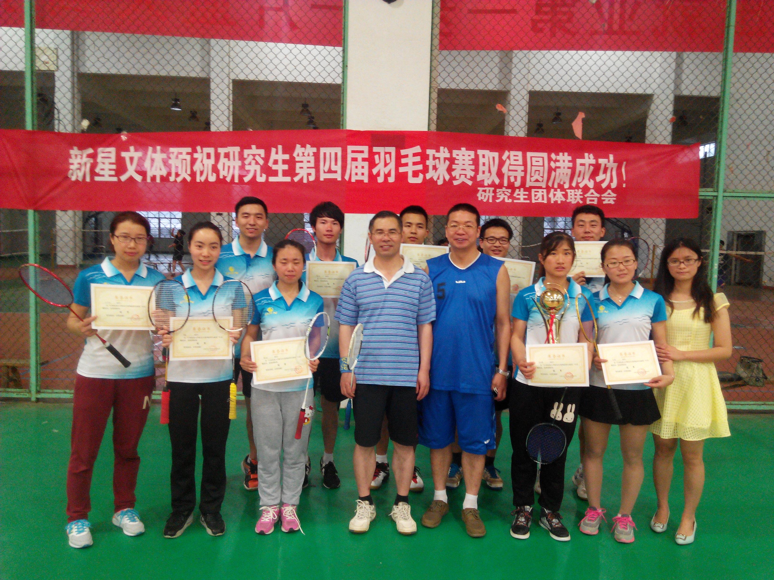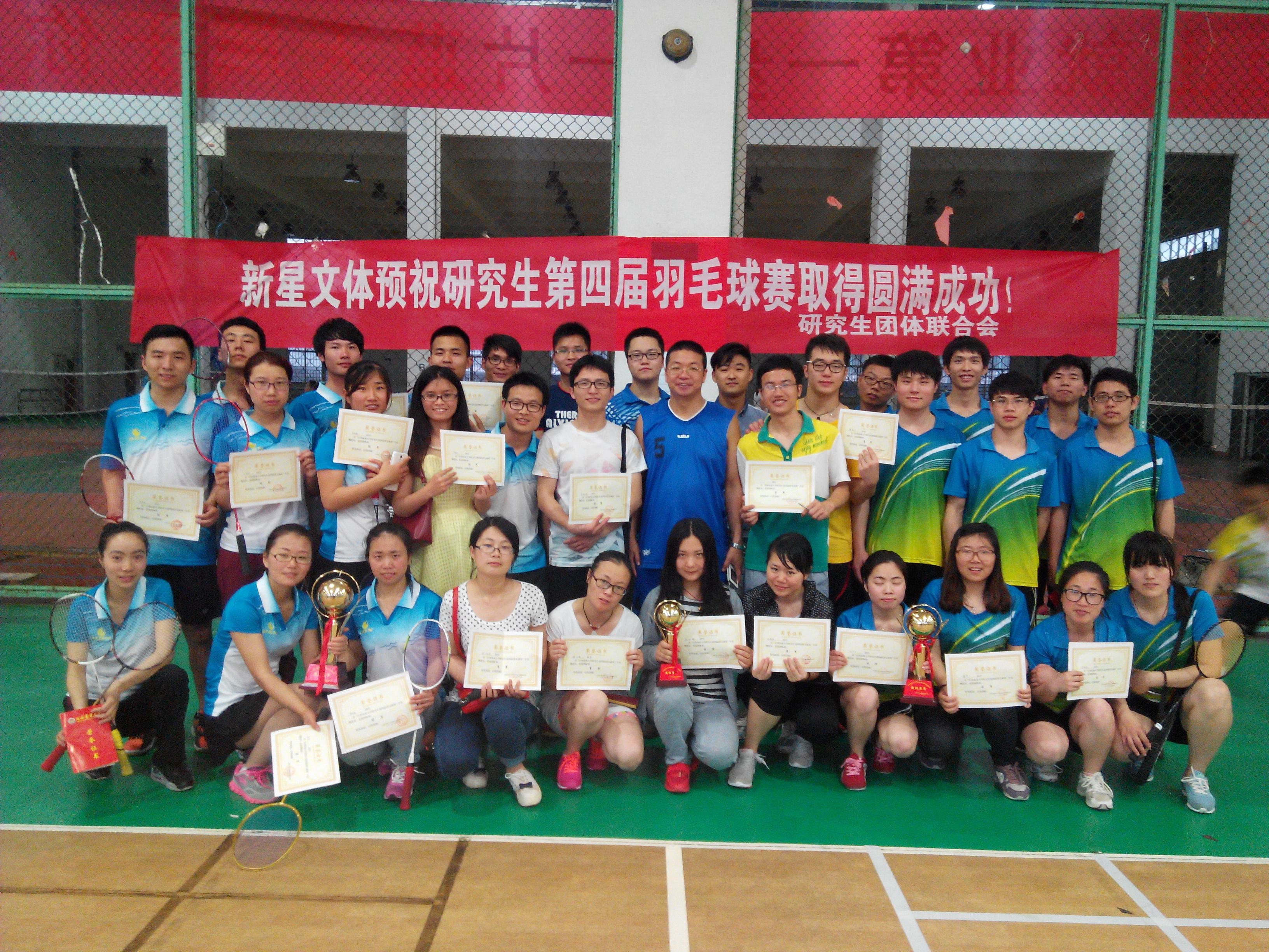 2015年5月10日,由研究生团体联合会羽毛球社承办的第四届研究生羽毛球赛圆满落幕。此次羽毛球赛从3月25日报名开始,历经运动员的选拔、训练到最终决赛用时两个月。共有13个院、总计130名同学参加。为广大研究生同学呈现了精彩纷呈的120场小组赛、80场淘汰赛、以及四强和决赛各20场,总计240场羽毛球比赛,刷新了研究生羽毛球比赛的最好数据。