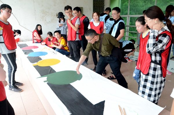 首先进行的项目是疯狂的毛毛虫和运转乾坤,这两个与众不同的接力赛格外考验队员们的默契配合及团队协作。队员们不顾高温,挥汗如雨,齐心协力,竭尽全力为集体争取荣誉,将青春激情展现得淋漓尽致。其次进行的项目是首次在我校进行尝试的极具挑战性的纳斯卡巨画,各小组分工明确,各显其能,稳中有序,共同挥毫泼墨近2个小时,成功揭开巨画的神秘面纱。最后进行的项目是旨在提升团队领导艺术的卓越圈,全队人坐下脚后跟着地,双腿并拢,用力握住绳圈共同逆时针摇动,顺利完成自己设定的一个又一个目标。