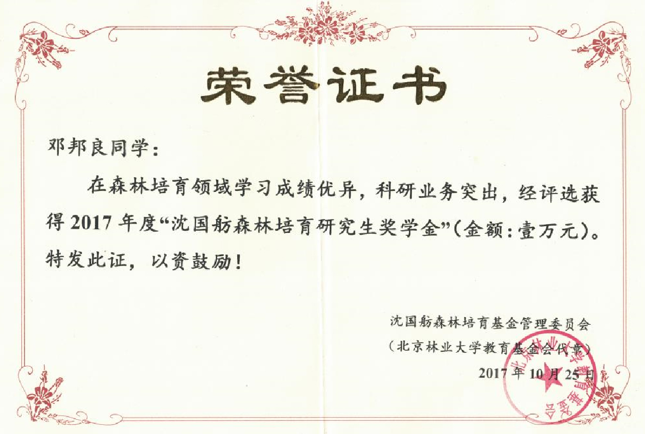 日前,“沈国舫森林培育基金”研究生奖学金获得者名单揭晓,林学院博士生邓邦良榜上有名(共5名研究生获奖),这也是林学院森林培育学科第2位获此殊荣的研究生。