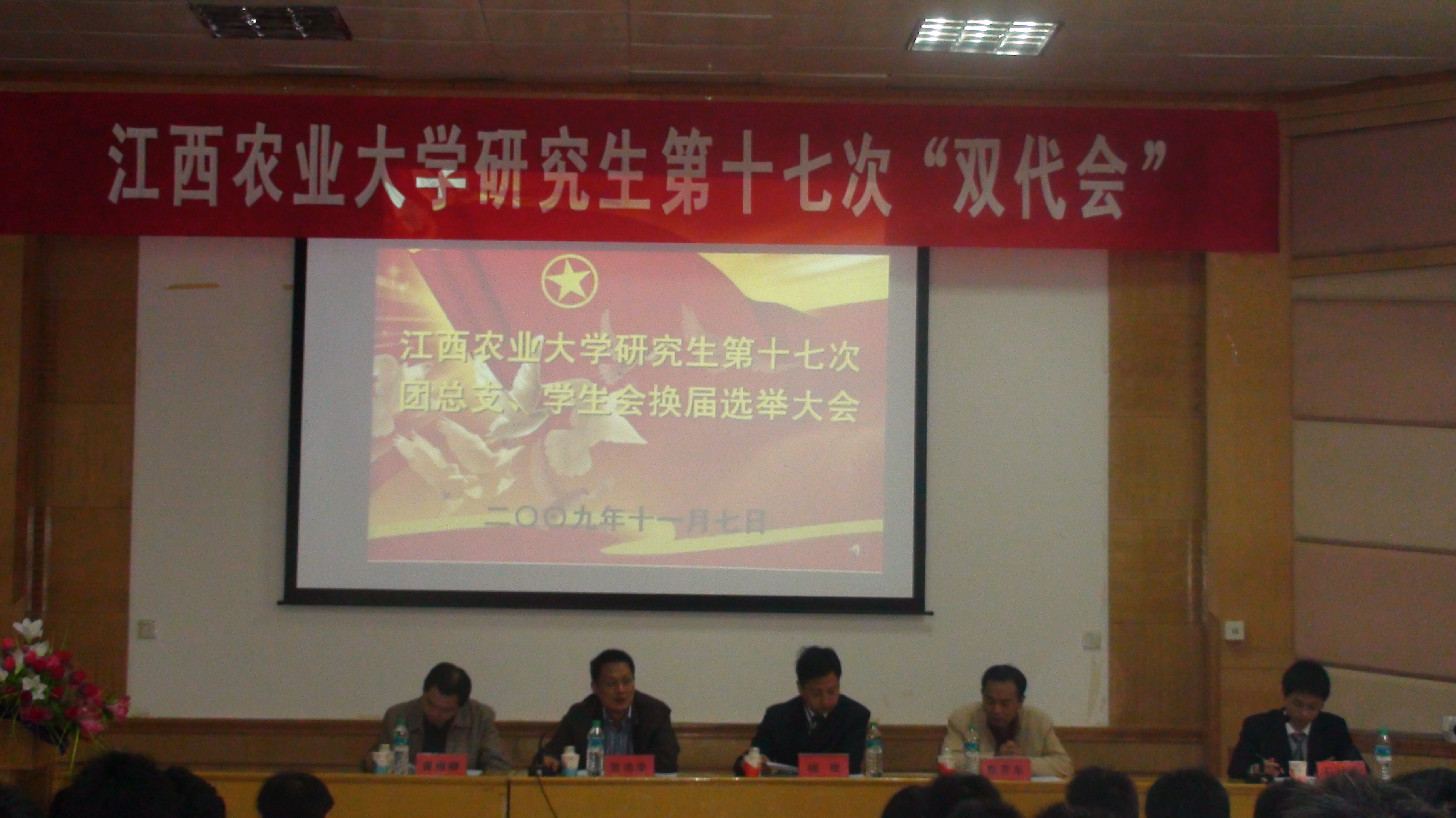 在伟大中华人民共和国成立六十周年之际,在全校上下深入学习和贯彻科学发展观之际,在校领导的关心和帮助下,在研究生处、校团委的亲切关怀和指导下,在全体研究生学生干部的共同努力下,江西农业大学研究生第十七次“双代会”于2009年11月7日上午9:00在校科技馆报告厅隆重开幕。莅临本次“双代会”的领导有江西农业大学副校长贺浩华教授,研究生处书记黄维柳副教授,校团委副书记、学工处副处长杨欢老师,研究生处副处长彭齐东老师,参加本次大会的来宾有南昌大学、江西财经大学、江西师范大学、华东交通大学、南昌航空大学、江西科技师范学院六所兄弟院校的研究生会代表,以及江西农业大学学生会、江西农业大学社团联合会代表。