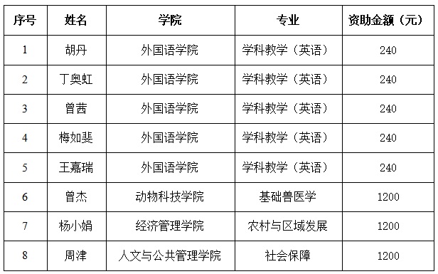 根据《江西农业大学研究生教育改革实施方案》(赣农大发〔2014〕10号)文件有关精神,我校近期开展了2018-2019学年硕士生助研津贴申请工作,经研究生导师本人申请,研究生基层培养单位同意,财务处审核,研究生院审批,现将“2018-2019学年硕士生助研津贴受助研究生名单”公示如下: